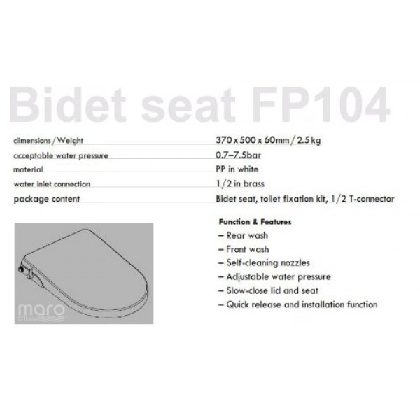 Maro D’Italia FP104 non-electric bidet seat (cold water) is the Original non-electric WASHLET with 45% higher water pressure! It elevates most UK WCs with twin nozzles (rear/front), adjustable spray pressure and automatic nozzle self-cleaning—clean lines, quick fitment and no electrical connection required.